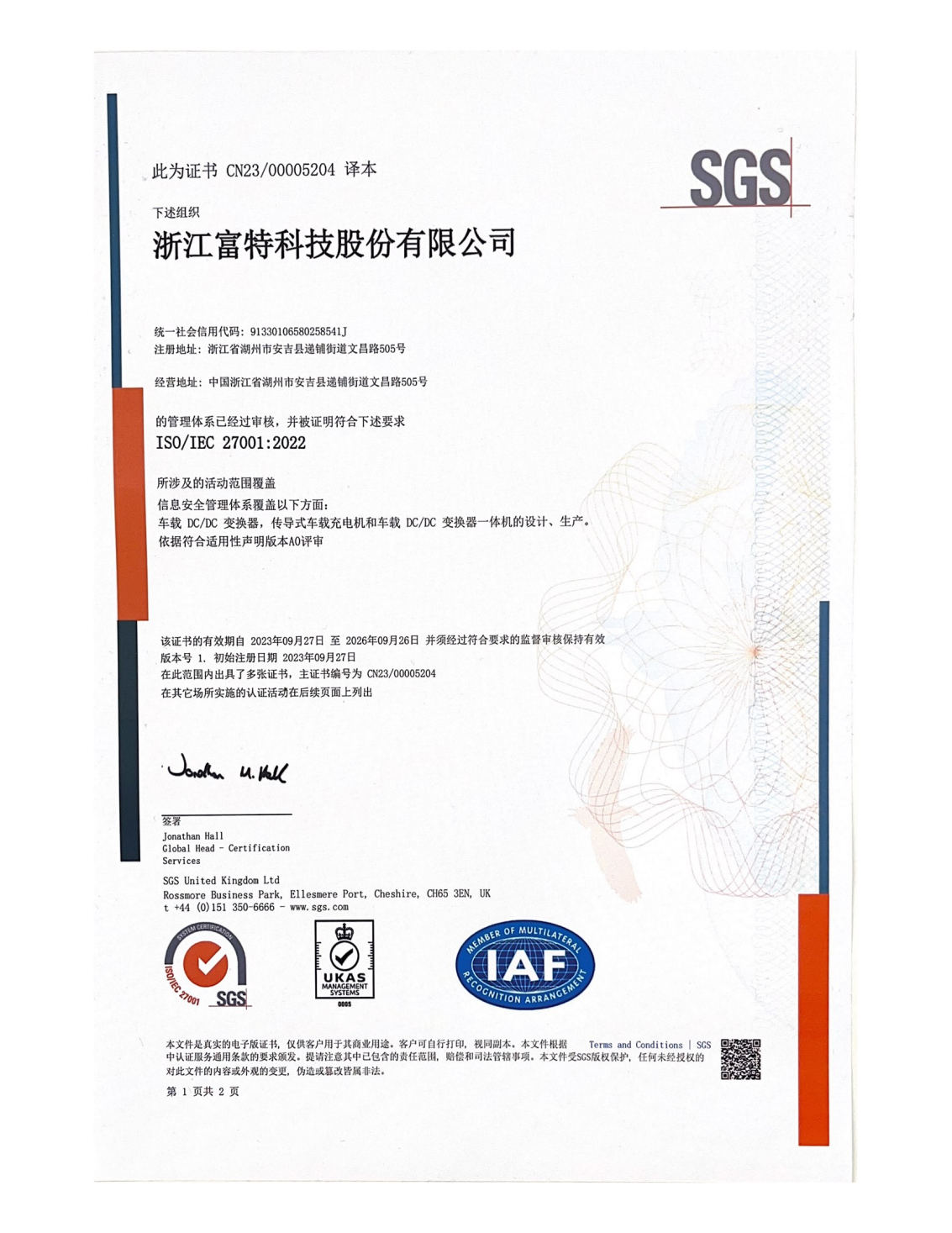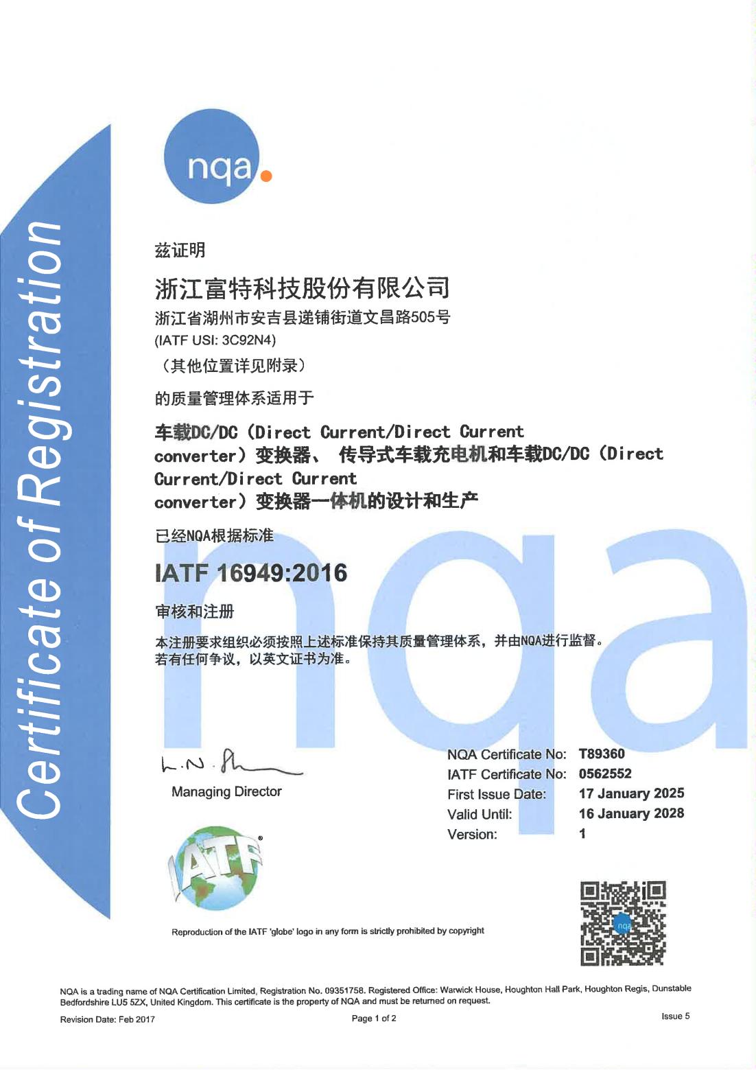 浙江富特科技股份有限公司,成立于2011年8月,生產基地位于湖州市安吉縣,研發中心位于杭州市西湖區、西安市高新區,是一家專注于新能源汽車核心零部件的國家級高新技術企業,是國內新能源汽車車載充電機及車載 DC/DC 轉換器的主要供應商。