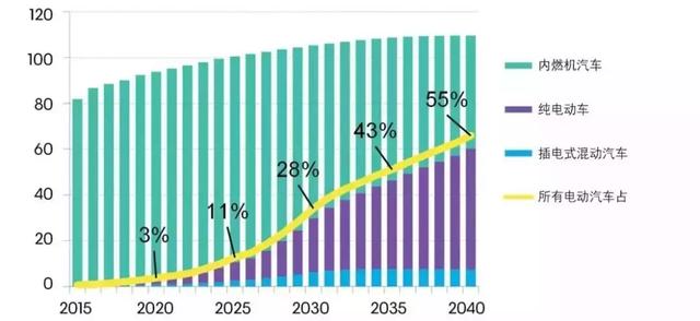 “到2040年,預(yù)計(jì)將售出約6000萬輛電動(dòng)車,相當(dāng)于全球輕型汽車市場的55%。”