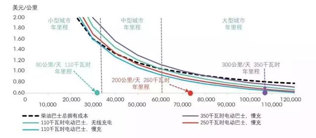 隨著每年行駛里程數(shù)的增加,電動(dòng)巴士的總擁有成本顯著降低,面對柴油巴士的優(yōu)勢逐漸擴(kuò)大。例如,一輛裝配有110千瓦時(shí)電池的電動(dòng)巴士加上最昂貴的無線充電裝置,每年行駛約60000公里時(shí)(3.7萬英里),其總擁有成本與柴油巴士持平。