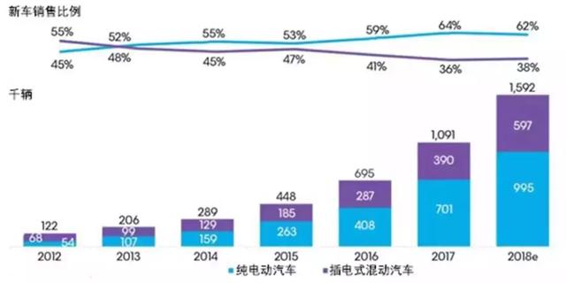圖1為2012年至2018年全球不同類型乘用電動(dòng)汽車銷量及預(yù)測