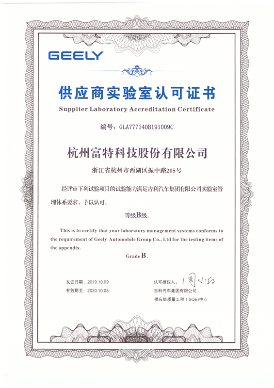 近期,富特科技順利通過吉利汽車供應商實驗室認可,并獲得相關證書。